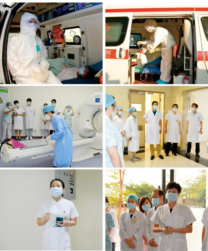 演練模拟一名發熱、咳嗽患者到我院就診,進入醫院大門,經過預檢分診到發熱診室。發熱診室醫生通過詢問病史及流行病學史、體檢、核酸檢測檢驗、胸部CT等相應檢查後,初步診斷爲新冠肺炎疑似病例。我院随即啓動應急預案,組織專家會診,向上級衛生行政部門報告,并按上級衛生行政部門指示,迅速将患者轉送至我市新冠肺炎診治定點醫院進行救治。随後,醫護人員按規範對發熱診室、CT室、救護車、患者行進路線進行終末消毒。