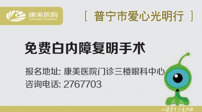 康美醫院作爲“普甯市愛心光明行”的合作單位,非常重視這份慈善事業,認真積極爲百姓送“光明”。我們的實際行動如下:一、在普甯市政協、民政局援助的基礎上,進一步借助總公司康美藥業的實力和愛心,給在我院手術的貧困家庭白内障患者再援助500元,實現了白内障手術醫療費用全免。