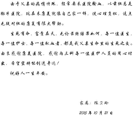 發布時間:2015-10-28 閱讀:6884前幾天内三科收到一封患者家屬的感謝信,讀後感人至深,字裏行間充滿了父慈子孝的感情,堪稱中國傳統美德的典範。現全文轉載如下。