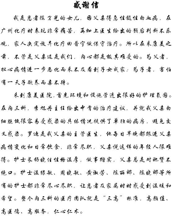 前幾天内三科收到一封患者家屬的感謝信,讀後感人至深,字裏行間充滿了父慈子孝的感情,堪稱中國傳統美德的典範。現全文轉載如下。