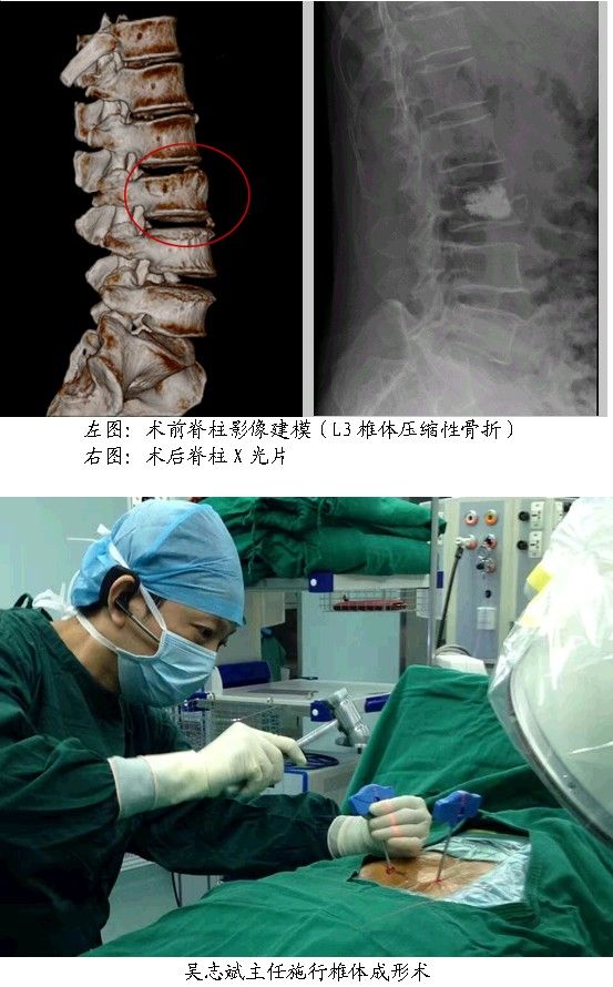 發布時間:2016-08-15 閱讀:3727患者林某,女,54歲,因滑倒跌傷,臀部着地,緻腰部疼痛、活動受限。随入住康美醫院外四科(骨科)。經腰椎CT檢查,确診爲L3椎體壓縮性骨折。8月5日,骨科主任吳志斌爲其施行脊柱微創手術——L3椎體成形術。手術十分成功,患者疼痛感消失,術後第二天即能下床行走,雙下肢活動良好,感覺正常。術後第三天出院。